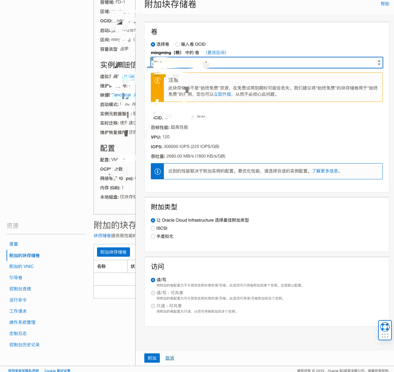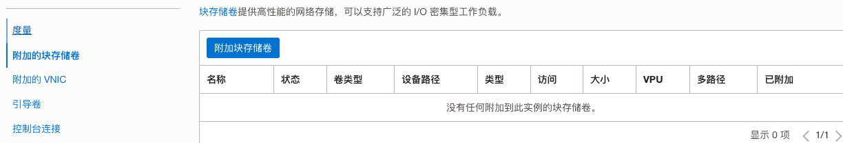 甲骨文后台=>计算>>实例>>实例详细信息>>附加的块存储卷
