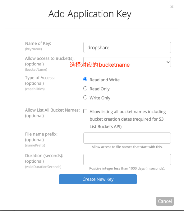 Add a New Application Key,选择好要操作的bucket,生产即可。创建成功之后保存这个信息,因为关闭之后就不会再显示了。