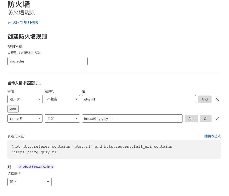 如果 请求头(referer)里面没有包含有我博客的域名(白名单域名),并且(and),完整请求(url full)里包含有我的图床域名,那么就阻止这个请求.