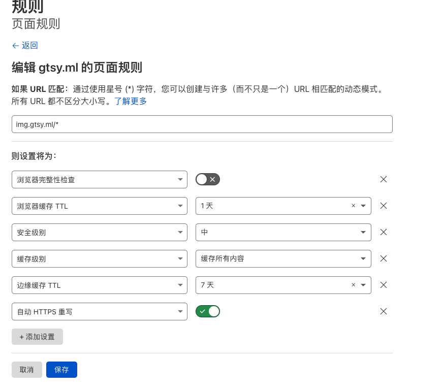 点击域名主页,规则设置,点击创建页面规则,输入你的图床域名,注意后面要有一个星号,即:你的图床域名/* ,因为这个页面规则是按照你的url匹配的,所以需要一个通配符来匹配(你也可以自行设置).