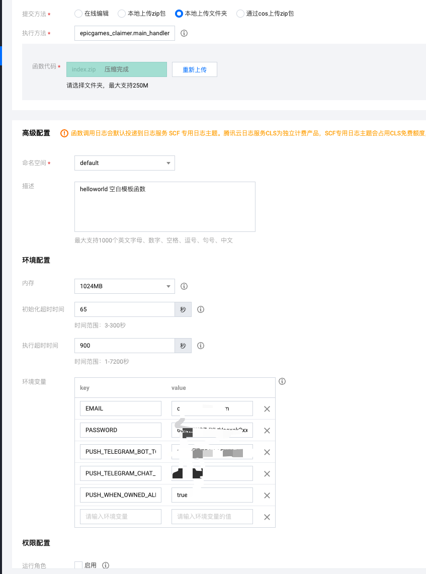 epicgames_claimer.main_handler环境配置中内存设置为1024MB,超时时间设置为900