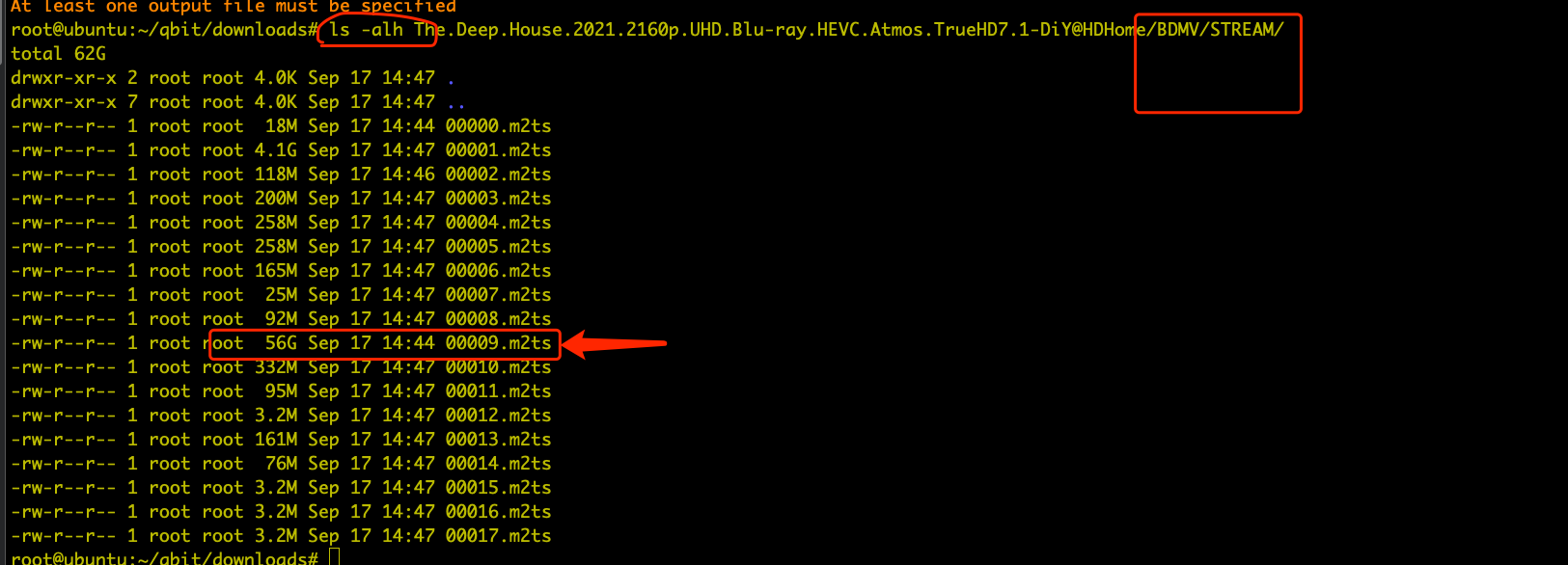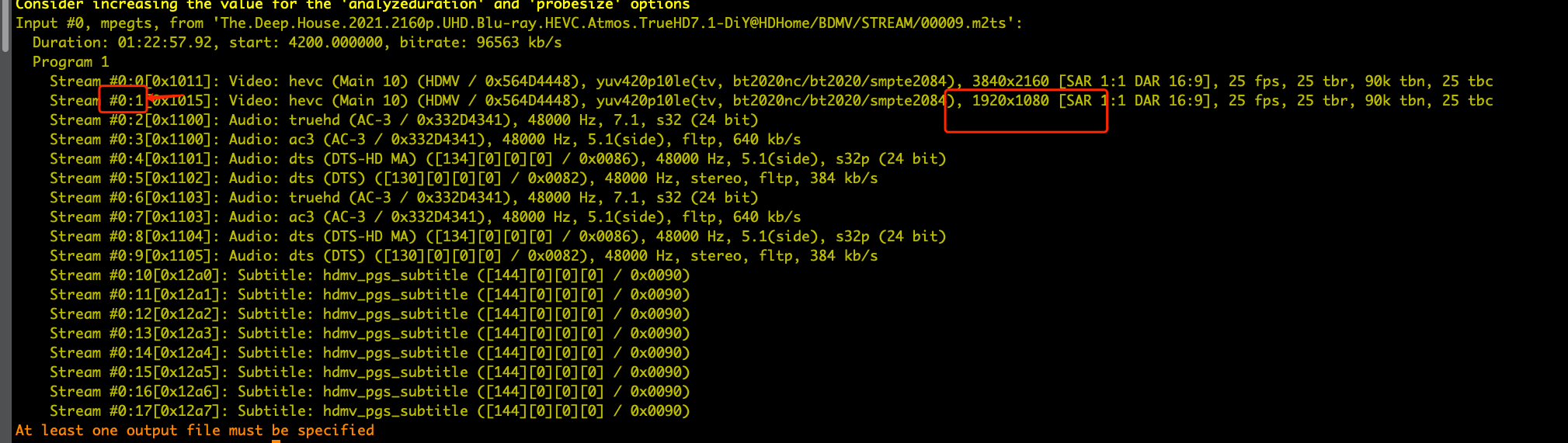 上面的例子就是ffmepg -i The.Deep.House.2021.2160p.UHD.Blu-ray.HEVC.Atmos.TrueHD7.1-DiY@HDHome/BDMV/STREAM/00009.m2ts